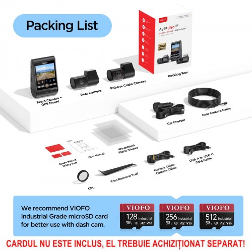 Viofo A229 Ultra este o cameră DVR auto, nu un sistem de navigație prin GPS și nu are conexiune la internet sau Cloud. Este interzisă folosirea altor cabluri sau surse de alimentare în afară de cele din pachet sau vândute de VIOFO.